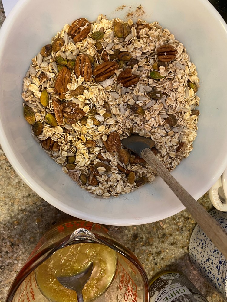 - Stir the mixture really well to completely coat the oats and nuts. Sometimes I will use clean hands to mix the granola at this stage to fully coat the oats.