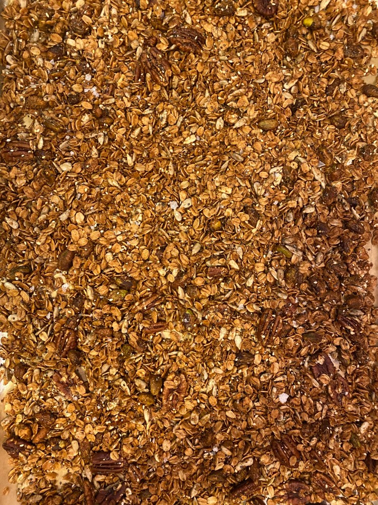 - I cooked the granola in 15, 15, 15, 10, and 5 minute increments stirring after each allotment of time and then spreading the granola evenly again across the pan. Pull the granola from the outside of the pan while stirring and bring it to the center to prevent the edges from overly browning.