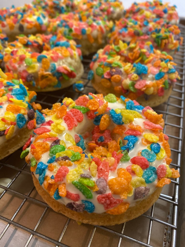 I once worked at a donut shop for a grand total of five hours. It was an absolute nightmare on multiple levels and took a week to wash the fryer smell out of my hair. Luckily these donuts are baked and not fried and are made with love instead of health code violations. I didn’t want to look at another donut after that, let alone eat one. But time has passed and I’ve softened to the idea. Honesty I’m all about cake for breakfast, why was I punishing my taste buds by not eating donuts? During quarantine all rules about diets have been thrown out the window. But hey, with a punch of vitamin C you can avoid scurvy while munching on breakfast cakes right? Maybe? Don’t quote me on that. This recipe comes together in minutes and is totally kid friendly with the bulk of the work in the whisking. Your tiny tots or tiny terrorists will have a great time dipping donuts in creamy icing and topping them with their favorite cereal. Have fun and be creative. You can use different cereals or top these babies with sprinkles, coconut flakes, or whatever your heart desires. I clearly disagree with Apu from the Simpsons sprinkle philosophy; a mounds bar could be a sprinkle, a twizzler could be a sprinkle, a jolly rancher could be a sprinkle. This is Shangri-la and anything can be a sprinkle. Go forth Homers of this world and decorate your donuts!