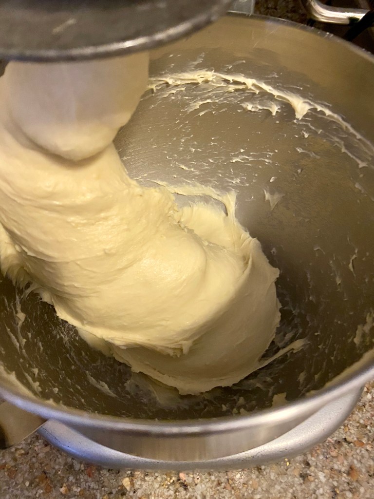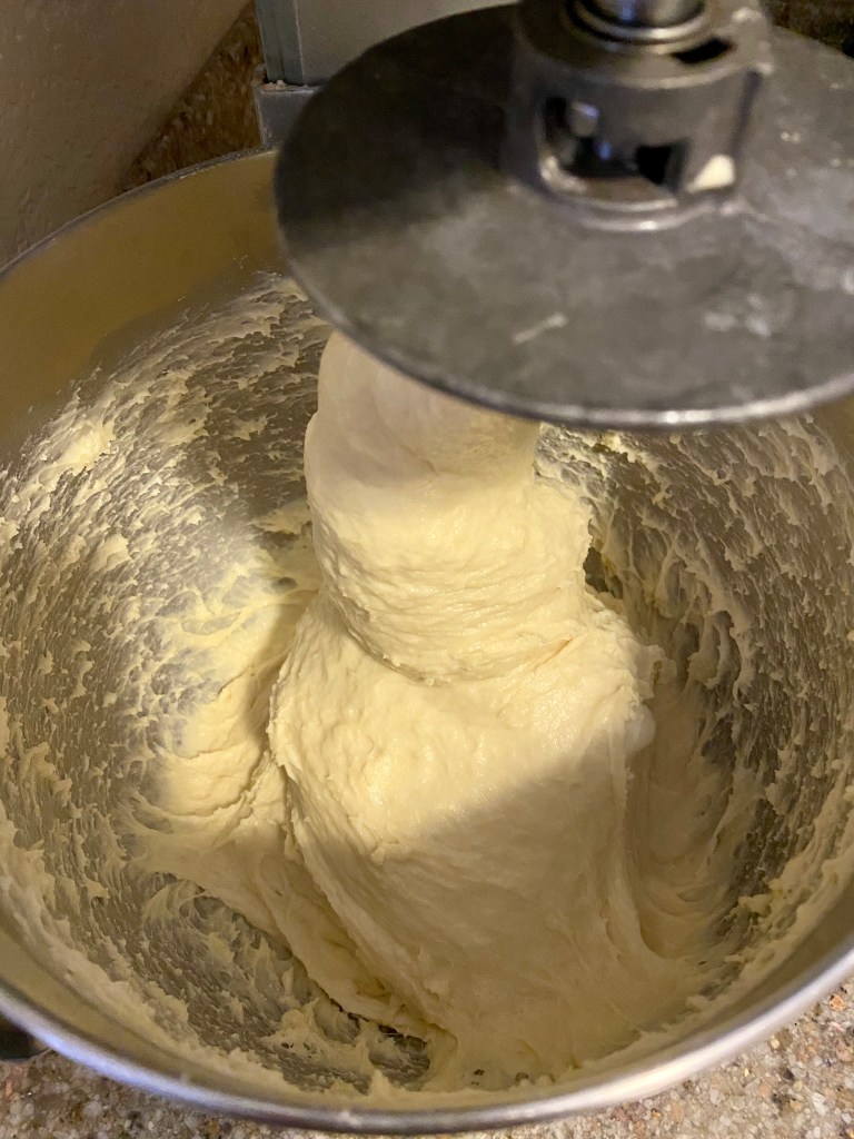 - Turn the mixer up to medium high speed and mix until the dough is smooth and elastic. Approximately 15 minutes. By using cold ingredients there’s less chance of breaking the fat out of the dough while mixing and getting a greasy product. It will take some time to develop gluten because this dough is heavily enriched.