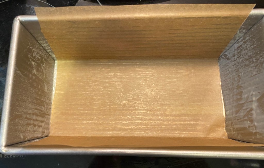 - Preheat oven to 325F. Spray a 8 1/2″ x 4 1/2″ x 2 3/4″ loaf pan with pan release spray and line with parchment paper.