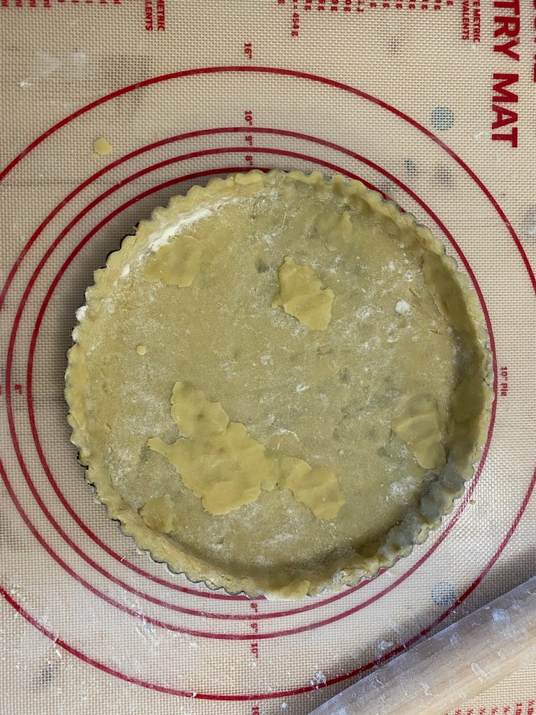 - Gently fold the crust in half and half again to transfer it easily into the tart pan. Position the crust into your pan with the center point in the center of the pan and unfold. Press crust into the edges of the pan. Trim any excess crust. This dough is brittle and can be challenging to work with, so if you’re having a hard time no worries. Just press the pieces of dough together in the pan like play-doh.