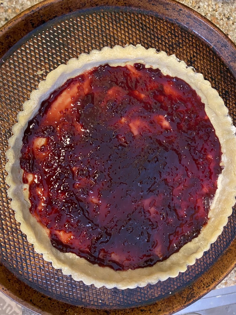- In the base of the crust spread cherry jam into a thin, even layer.