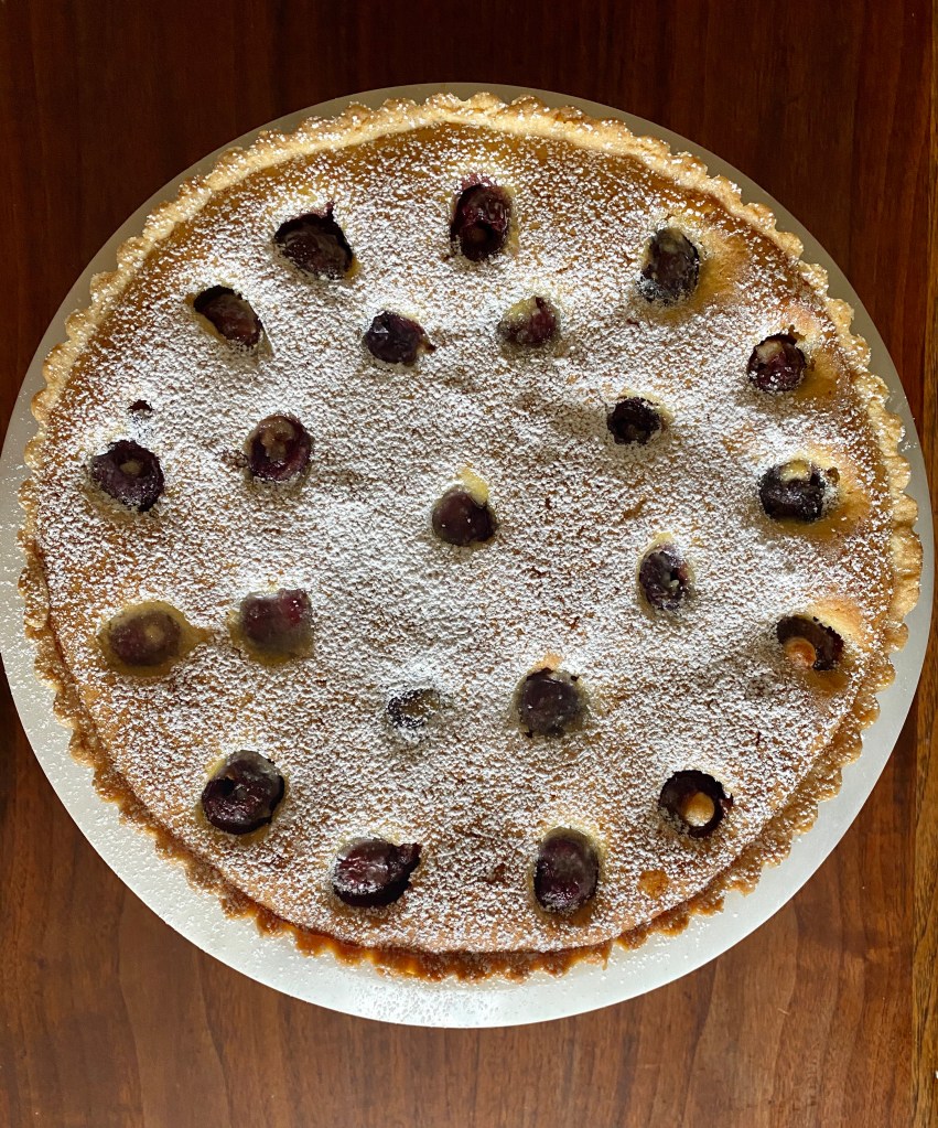 So maybe life hasn’t been a bowl of cherries lately. Some of us are returning to work while some of us are muddling through our third month in quarantine. The world feels incredibly different that it did a few months ago. I am still, as always finding comfort in cooking. I like to think we’re pretty good at cooking “seasonally” in our house. But honestly I think with everything going on we may have missed spring. Usually in the spring I’d be blanching peas and roasting asparagus or sautéing morels. Instead I’ve been playing Punxsutawney Phil and have mostly lived on potatoes for the last few months while avoiding my widening shadow. As stone fruit season marches towards us and summer is on the horizon I feel my tastes shifting. As cherries and warm weather produce began appearing in the grocery stores I’m excited for the food season ahead. I love the combination of cherries and almonds and set off to make a frangipane tart that would satisfy a craving while not taking too long to make. Frangipane is a French word for a sugar, egg, and almond filling originally created in the 16th century and rumored to once have been scented with flower blossoms also named after an Italian aristocrat Marquis Frangipani. The more your know! You can find similar fillings in desserts like pithivier, king cakes, and almond croissants. This tart does have a few components but lucky for us I’m a lazy baker who hates dishes so we’re going to make the crust and filling in THE FOOD PROCESSOR!!!!!!! (Pretend I yelled that last line like Oprah.) Feel free to sub cherries for blueberries, apricots, or poached pears based on your tastes and seasonality. This tart is great warm or cold and wouldn’t mind if you served it with a scoop of vanilla ice cream and a shot of amaretto. Cheers to this tart, Frangipani flowers, Italian aristocracy of the 16th century, and to the hopes this human groundhog will eventually emerge from its wintery hole (my bedroom).